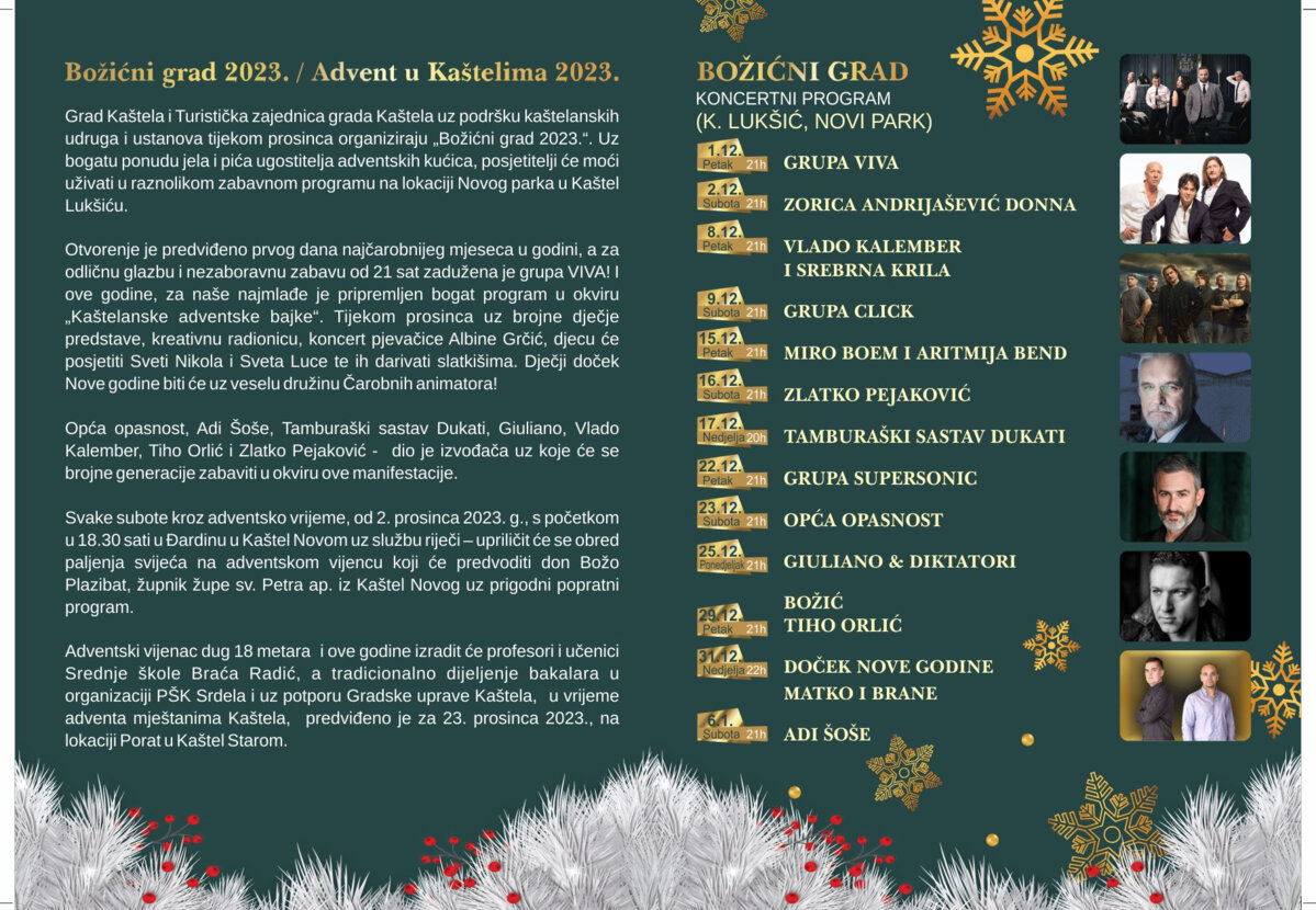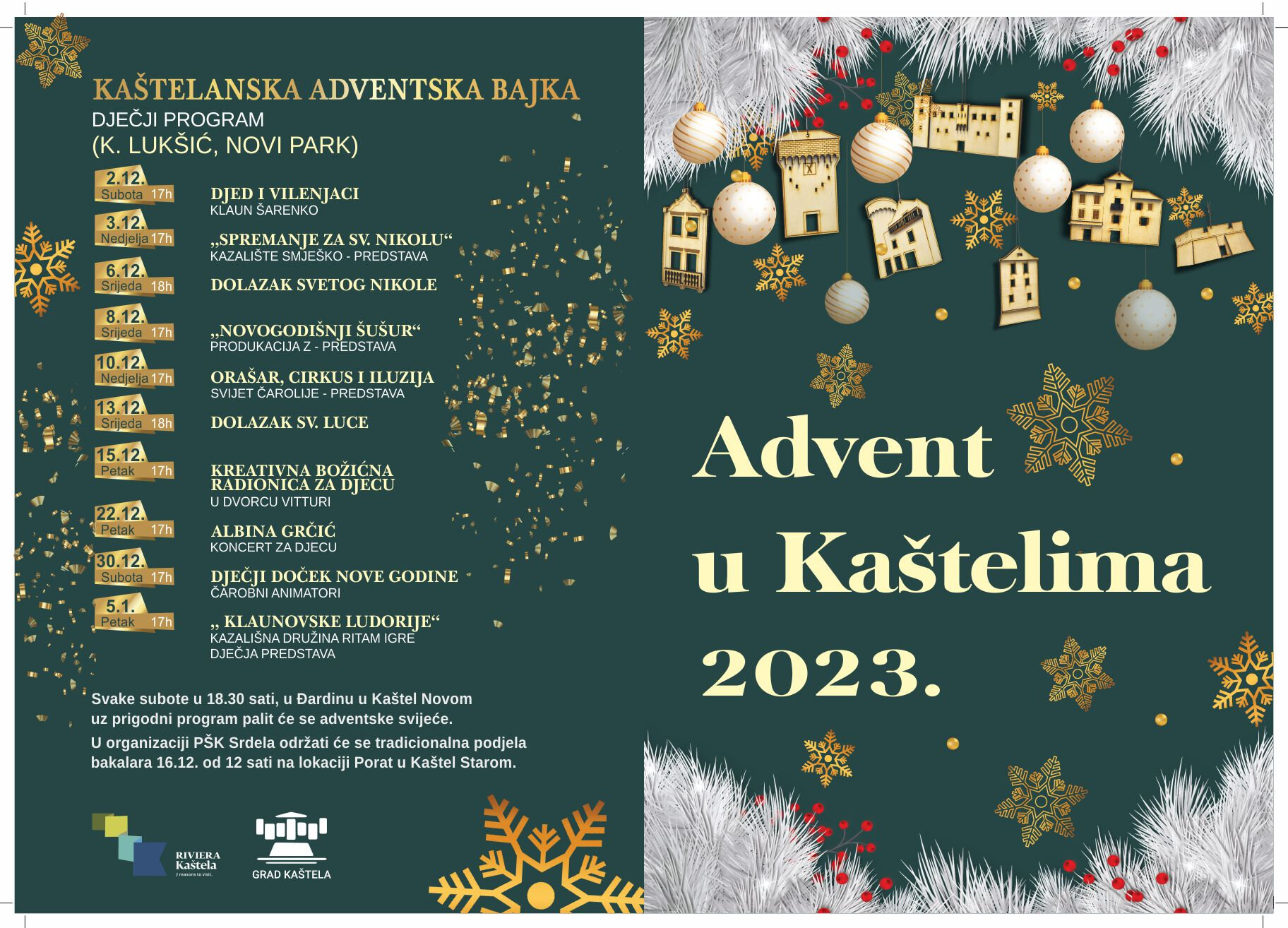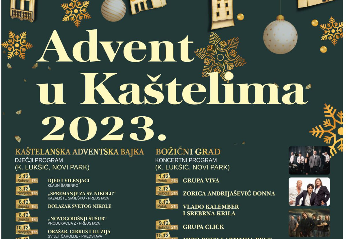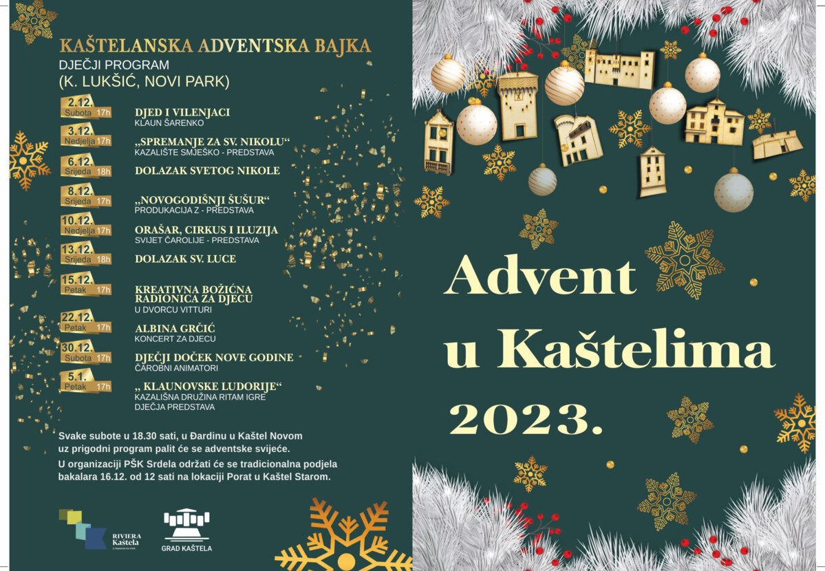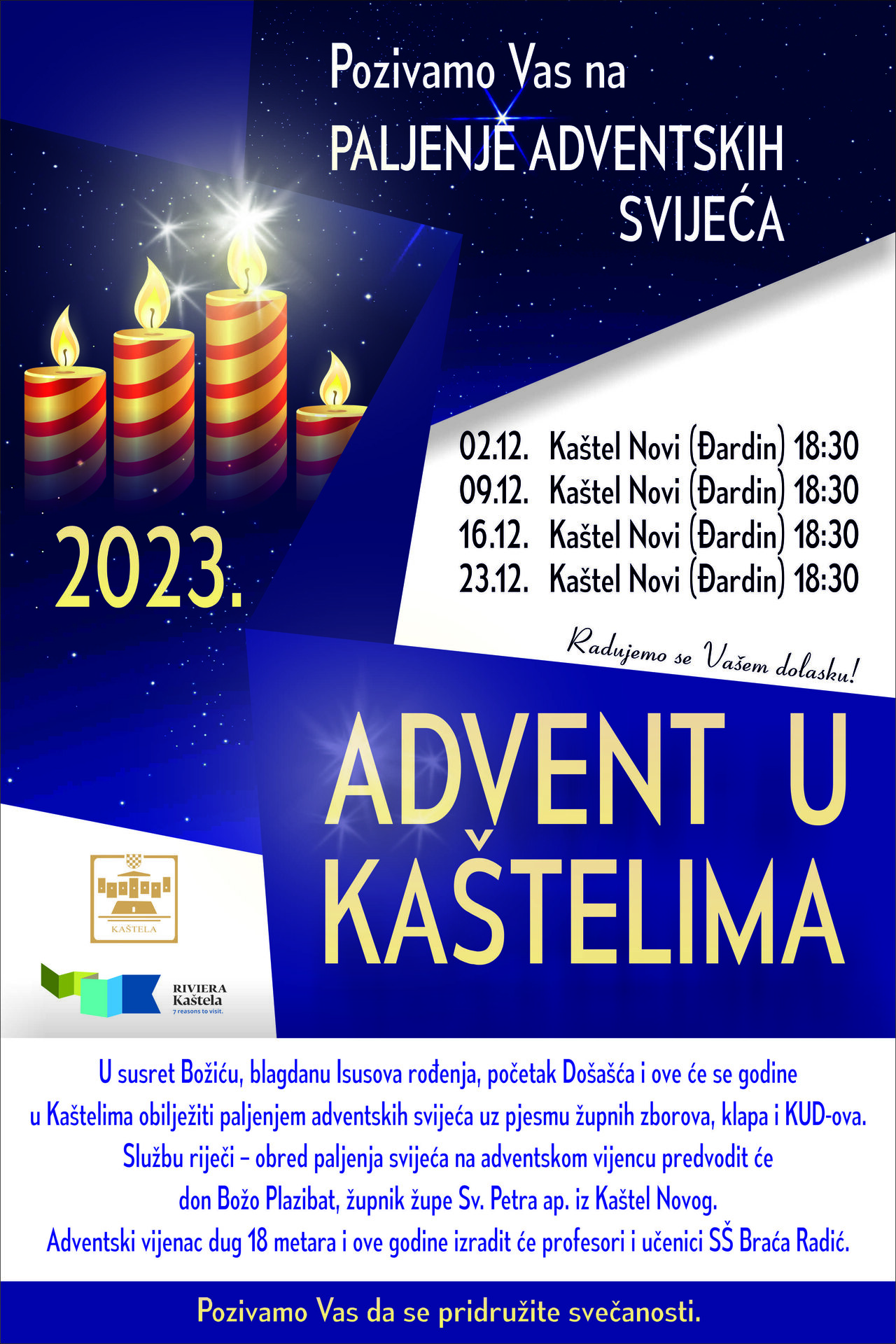 U susret Božiću, blagdanu Isusova rođenja, početak Došašća i ove će se godine u Kaštelima obilježiti paljenjem adventskih svijeća na dane 2. 12., 9. 12., 16. 12., 23. 12. uz pjesmu župnih zborova, klapa i KUD-ova. Službu riječi - obred paljenja svijeća na adventskom vijencu predvodit će don Božo Plazibat, župnik župe Sv. Petra ap. iz Kaštel Novog. Adventski vijenac dug 18 metara i ove godine izradit će profesori i učenici SŠ Braća Radić.