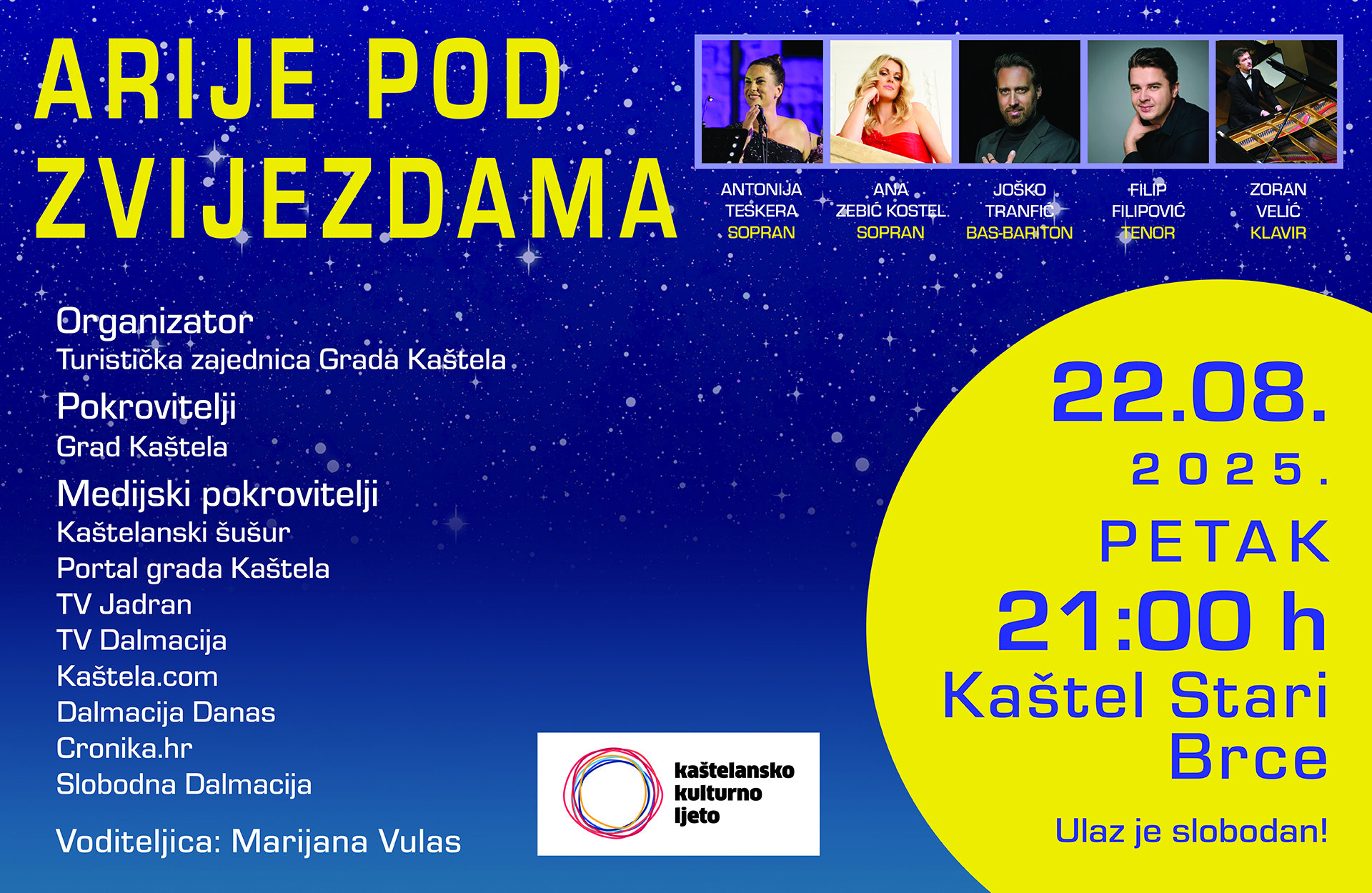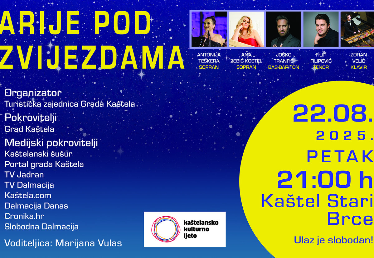 Kaštel Stari ponovno postaje pozornica za nezaboravno glazbeno iskustvo. Na tradicionalnom koncertu "Arije pod zvijezdama", koji će se održati u petak, 22. kolovoza, s početkom u 20:30 sati na Brcu u Kaštel Starom, uživat ćemo u izvedbama najljepših opernih arija.