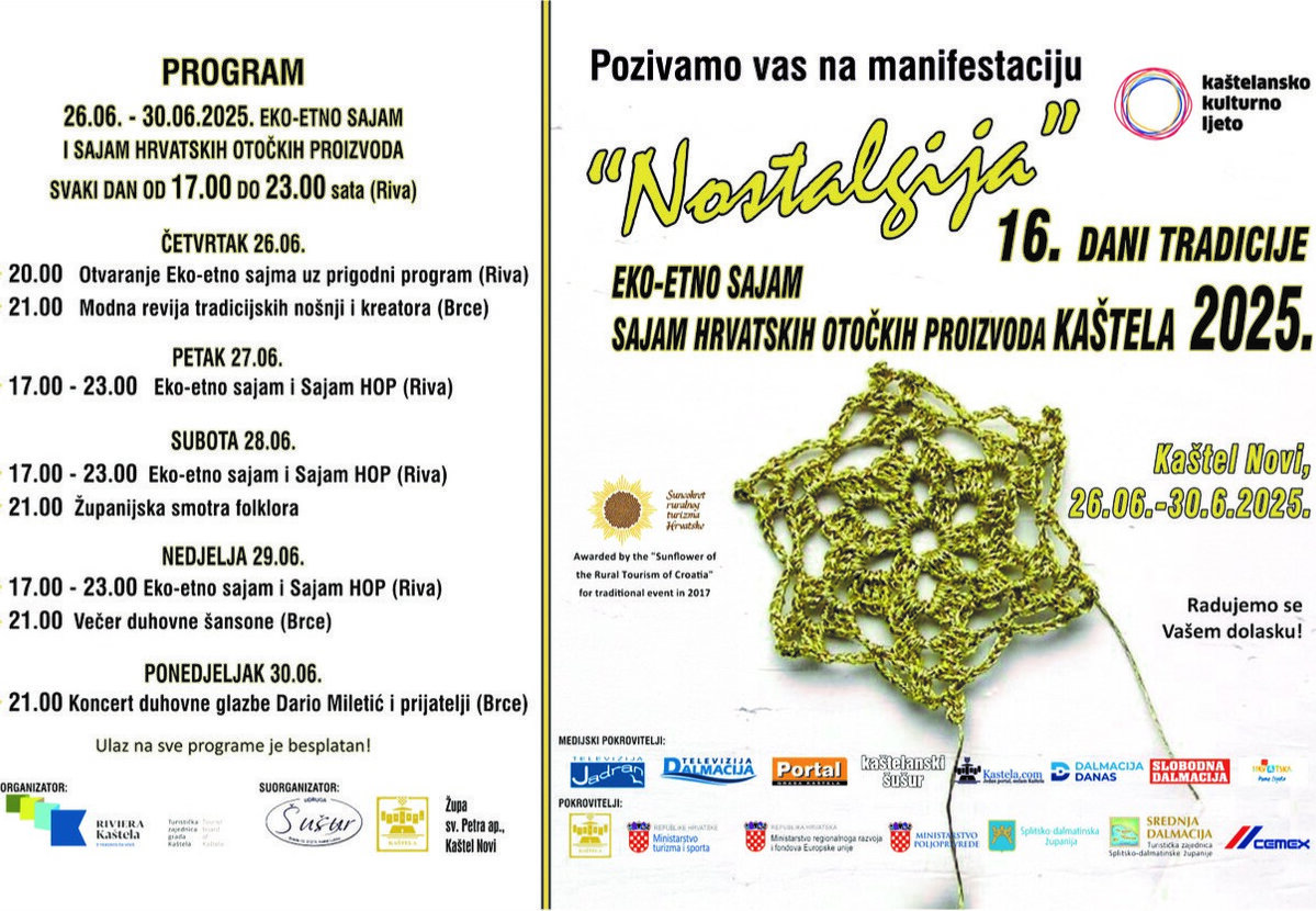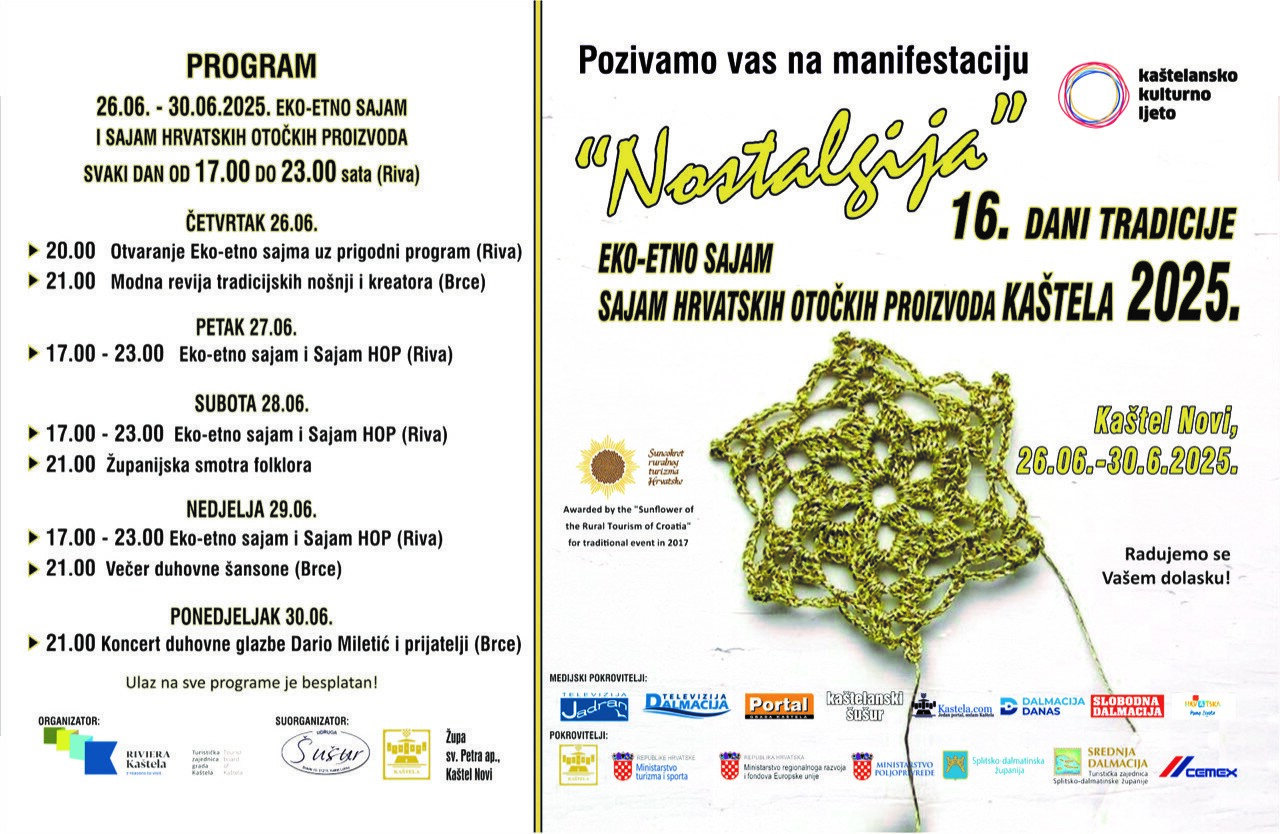 16. Dani tradicije “Nostalgija” – Kaštela 2025, održat će se od 26.lipnja- 30. lipnja 2025. g. u K. Novom, na Rivi i Brcu u organizaciji TZG Kaštela, suorganizaciji udruge Šušur, a pod pokroviteljstvom Grada Kaštela, Županije splitsko-dalmatinske, TZ Splitsko-dalmatinske županije, Ministarstva regionalnog razvoja i EU fondova, Ministarstva turizma, Ministarstvo poljoprivrede, Cemex Hrvatska d.o.o.