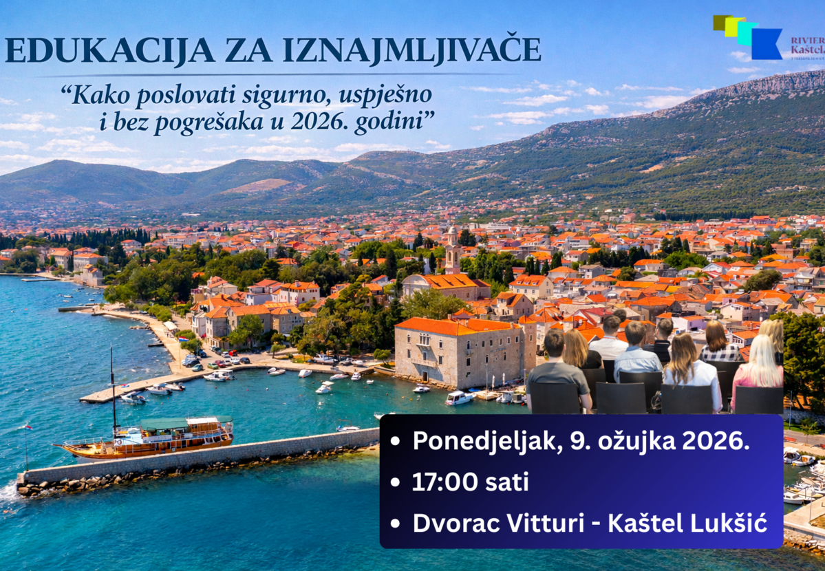 Turistička zajednica grada Kaštela poziva sve privatne iznajmljivače na stručnu i izrazito praktičnu edukaciju koja će se održati u ponedjeljak, 9. ožujka 2026. godine, u 17:00 sati, u predivnom ambijentu Dvorca Vitturi u Kaštel Lukšiću.
